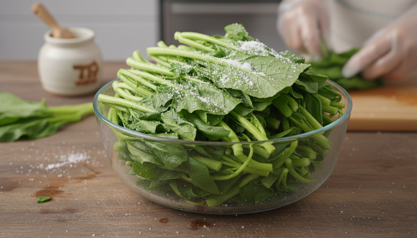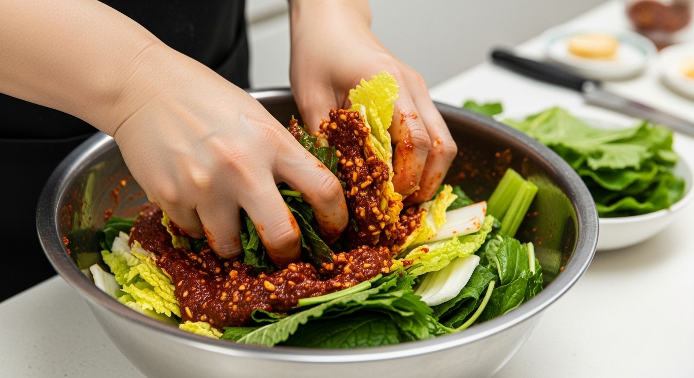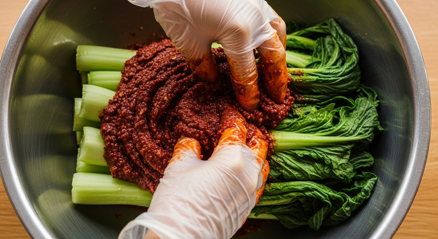 - 줄기 → 잎 순으로 양념을 올리고 손끝으로 부드럽게 눌러가며 바르듯 버무립니다.