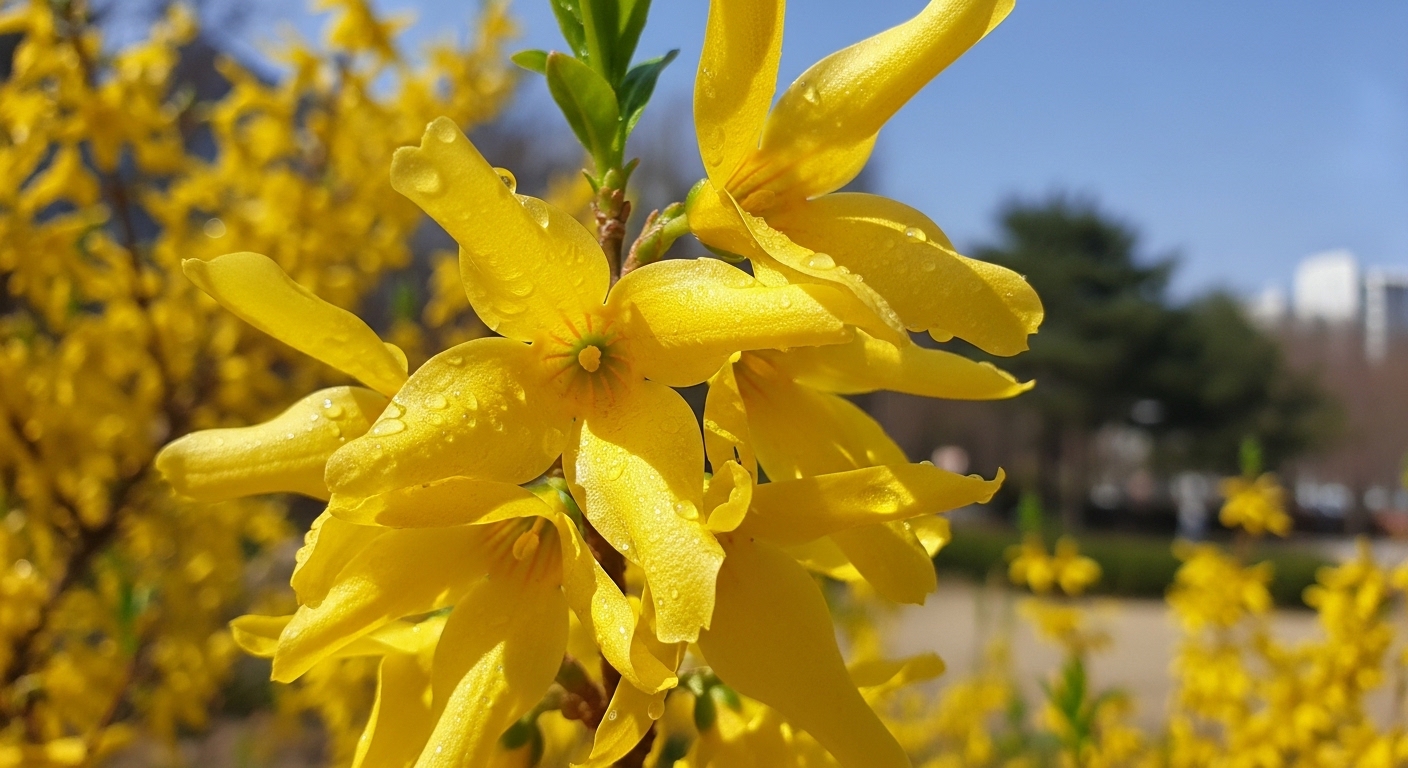 제가 개인적으로 가장 좋았던 순간은 비가 온 다음 날 아침이었습니다. 햇빛이 비친 개나리 꽃잎이 더 선명하게 보여서 평소보다 훨씬 화사한 느낌을 받았던 기억이 있습니다.