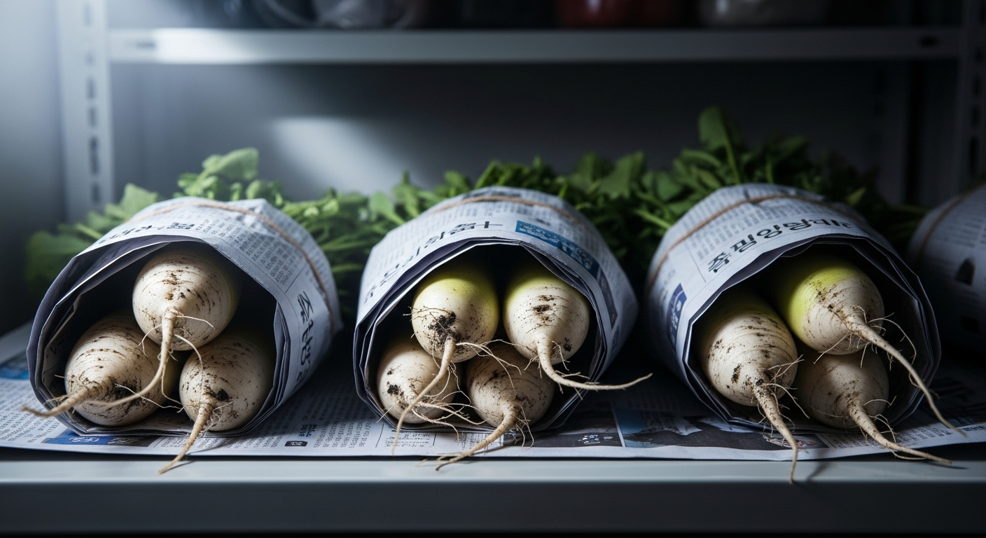 - 신문지 활용 - 무를 신문지나 키친타월로 꼼꼼하게 감싸줍니다. 신문지는 무의 수분 증발을 막아주고 외부의 습기를 차단하는 역할을 합니다.