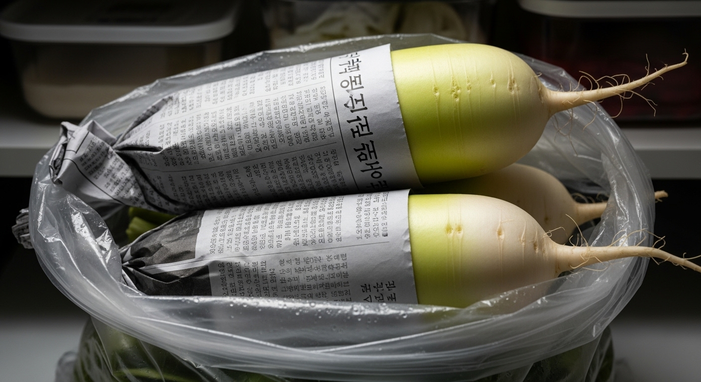 - 비닐 팩 포장 - 신문지로 감싼 무를 다시 비닐 팩에 넣어 밀봉합니다. 이때 입구를 완전히 막지 않고 약간의 숨구멍을 남겨두는 것이 좋습니다.