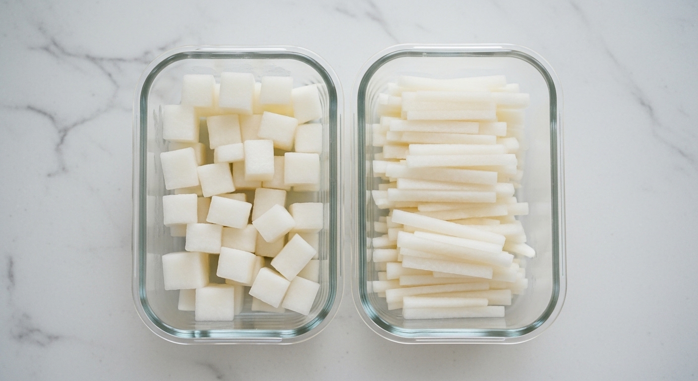 무를 한 번에 다 사용하지 않고 일부만 사용할 경우에는 용도별로 썰어서 보관하면 요리 시간을 단축할 수 있습니다.