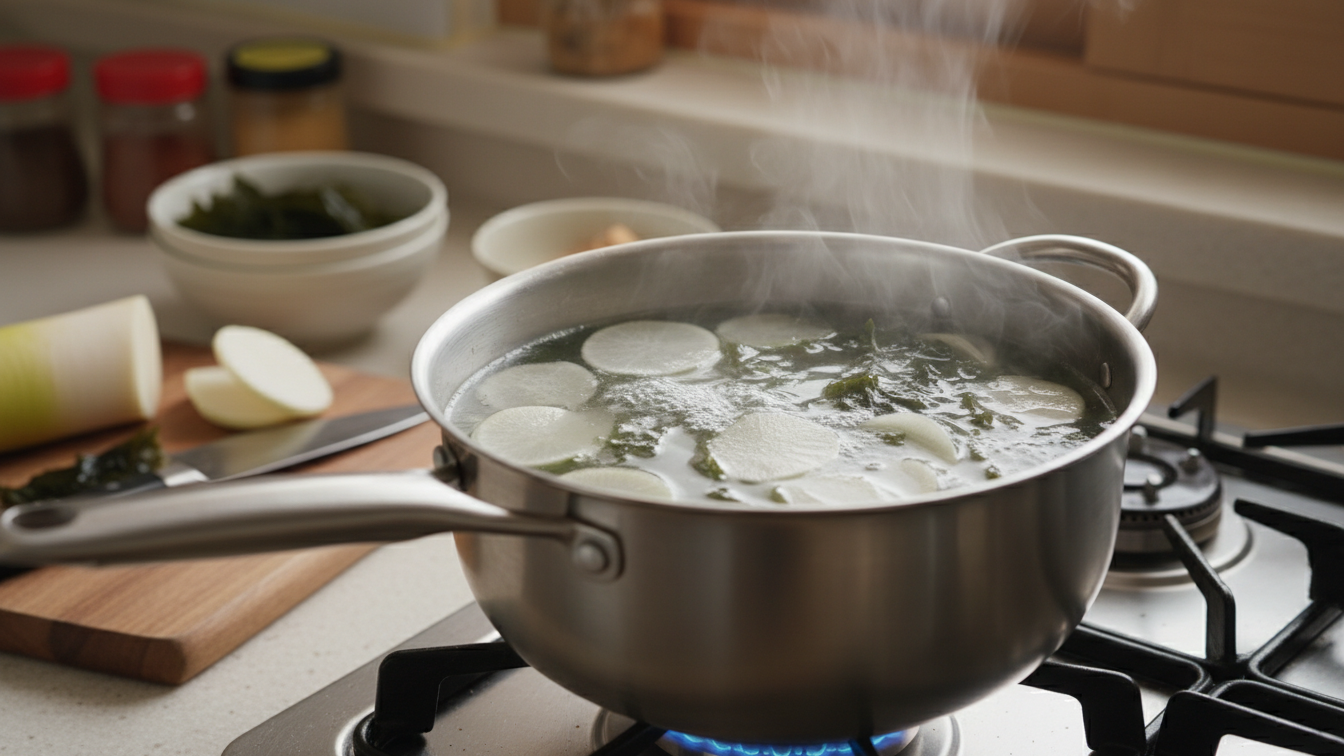 - 끓기 직전 다시마를 건져내어 쓴맛을 방지합니다.