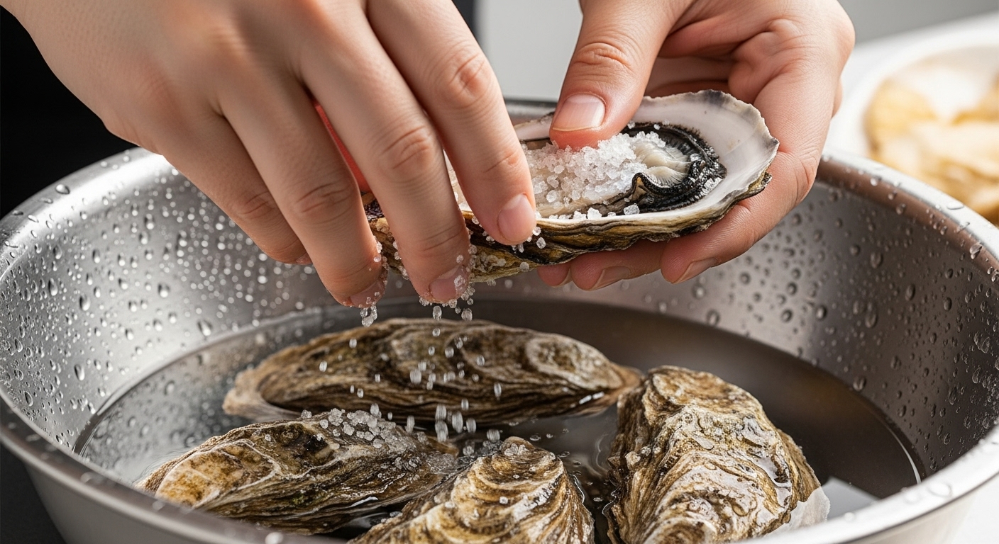 - 굵은소금 한 꼬집을 넣고 굴끼리 부딪히지 않도록 살살 비벼 불순물을 제거합니다