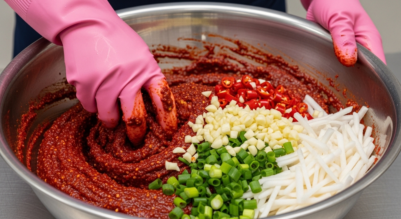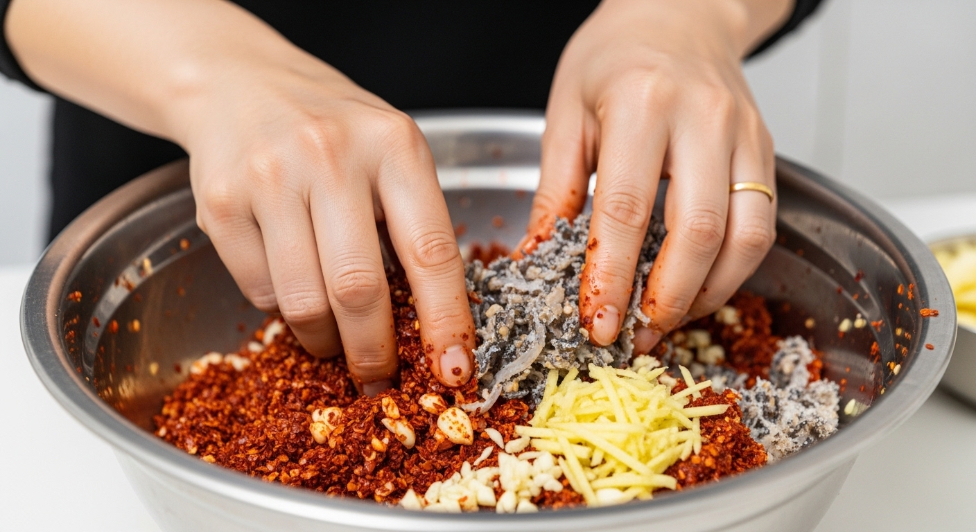 절인 배추가 준비되었다면 이제 김장김치의 맛을 좌우하는 양념소를 만들 차례입니다. 단순히 고춧가루와 젓갈만 섞는 것이 아니라 깊은 감칠맛을 내는 육수와 각종 부재료의 조화로운 배합이 맛있게 담는법의 핵심 비결입니다. 양념은 배추 10포기 기준으로 고춧가루 10컵(종이컵 기준) 정도가 들어갑니다. 미리 개어두어 고춧가루를 불려야 색이 곱고 맛이 겉돌지 않습니다. 여기에 비법 육수를 더해 깊은 맛을 냅니다.