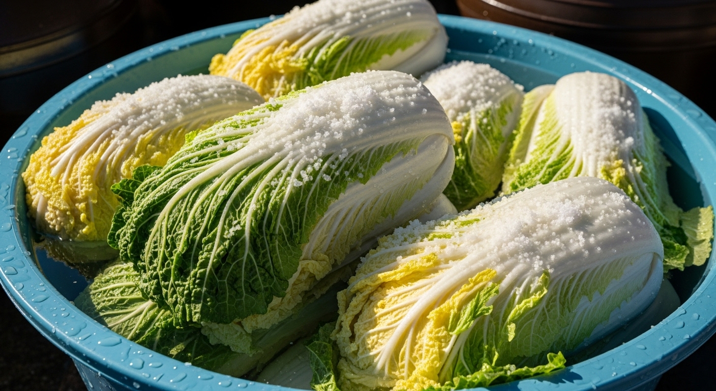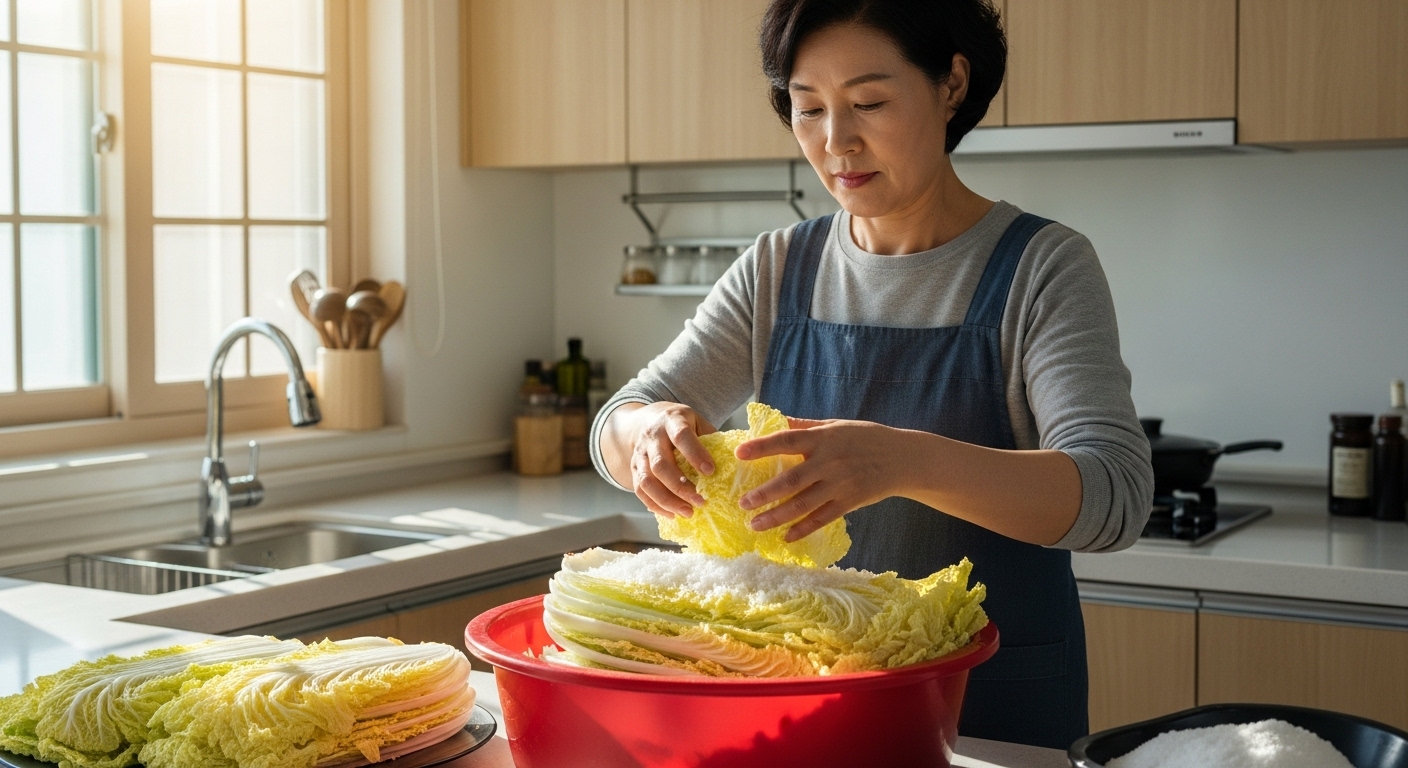 물 10리터 기준으로 천일염 1kg에서 1.2kg 정도를 녹인 소금물이 가장 이상적입니다. 배추를 반으로 갈라 이 소금물에 충분히 적신 후 두꺼운 줄기 부분 켜켜이 웃소금을 한 주먹씩 뿌려주면 간이 골고루 배어듭니다.