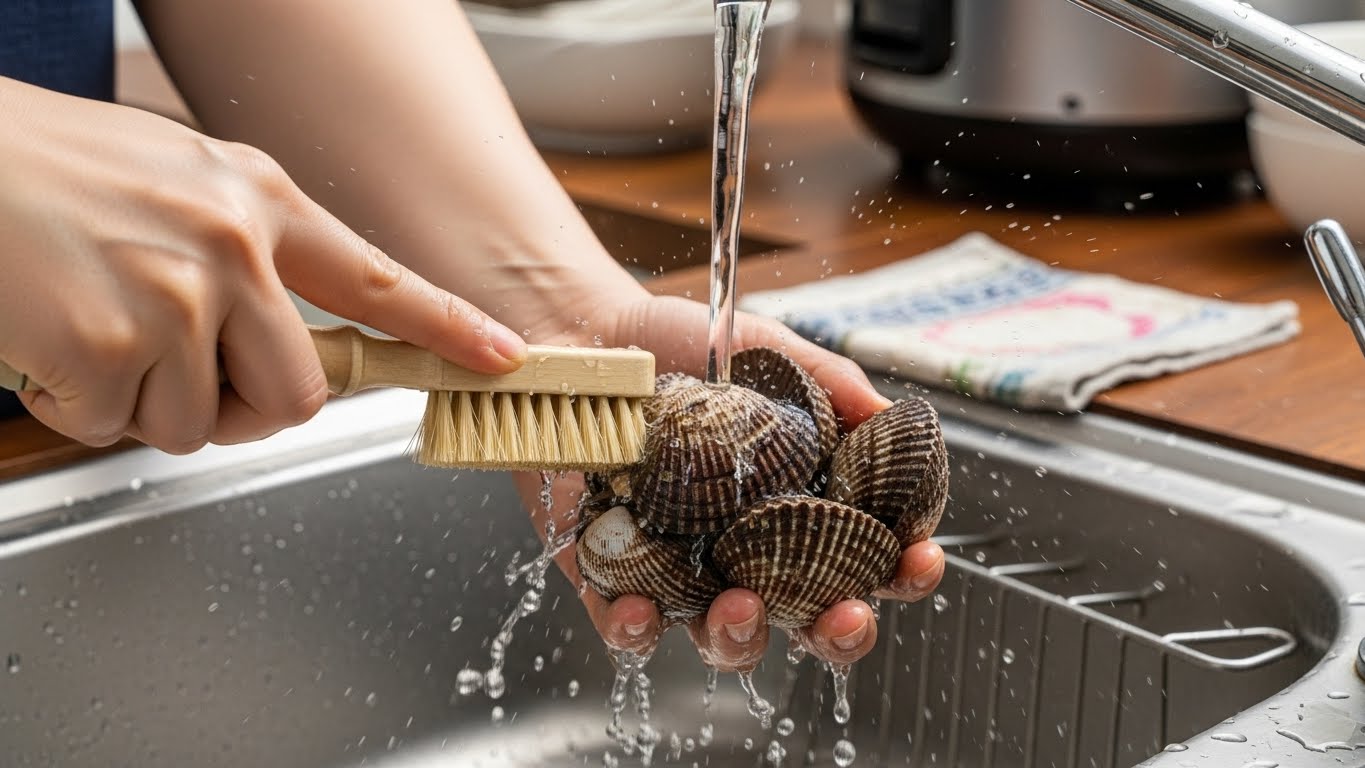- 해감 후 까끌한 껍데기는 솔로 가볍게 문질러 세척합니다.