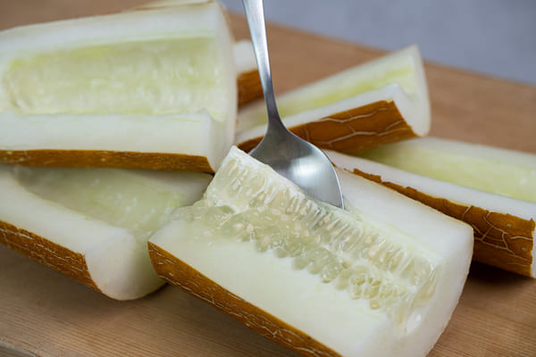 - 노각은 껍질이 두껍기 때문에 먼저 감자칼로 껍질을 벗기고 숟가락으로 속의 씨 부분을 긁어 제거합니다. 씨가 많으면 무침이 물러지므로 반드시 제거해야 합니다.