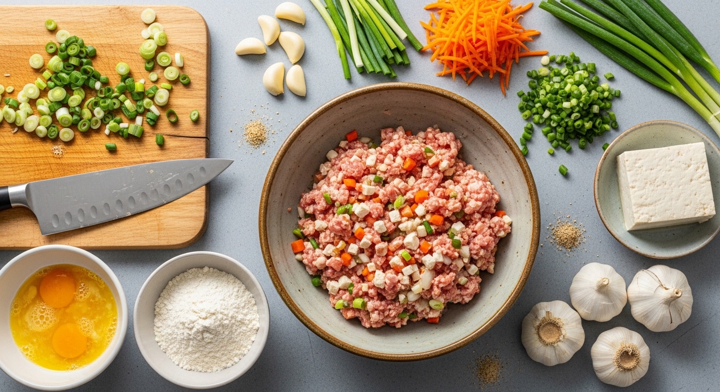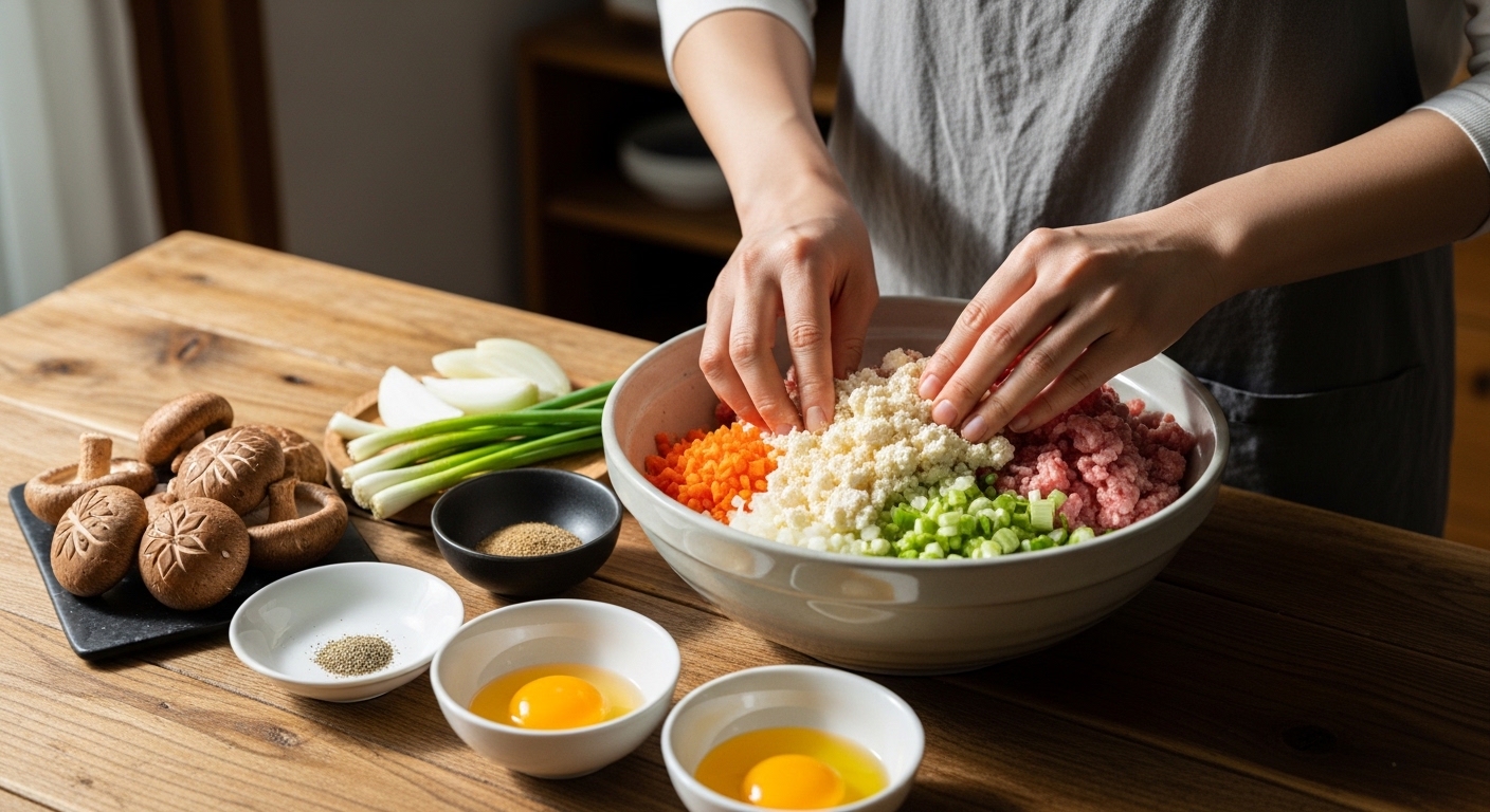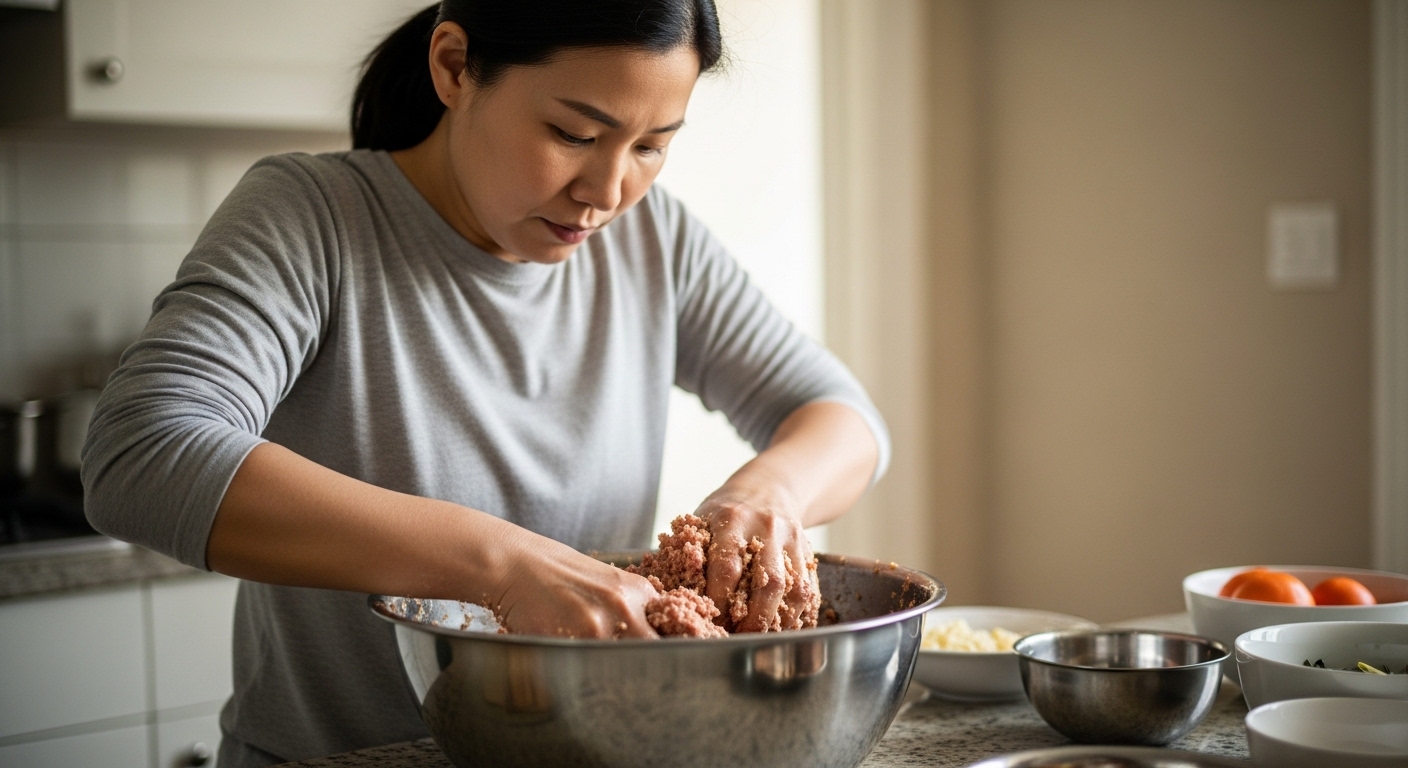 동그랑땡의 맛을 좌우하는 첫 단계는 고기와 채소의 비율입니다. 맛있게 만드는법의 기본은 수분과 지방의 균형입니다.