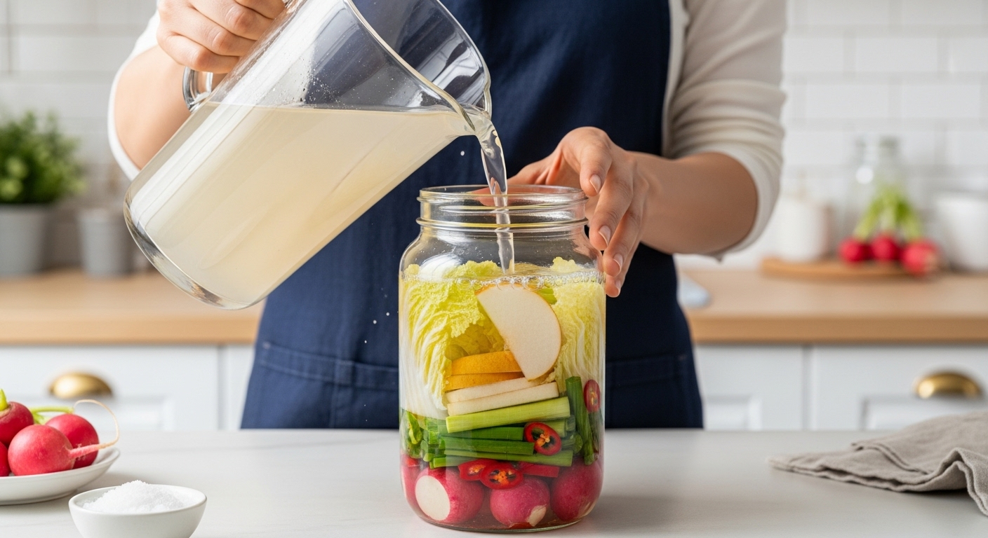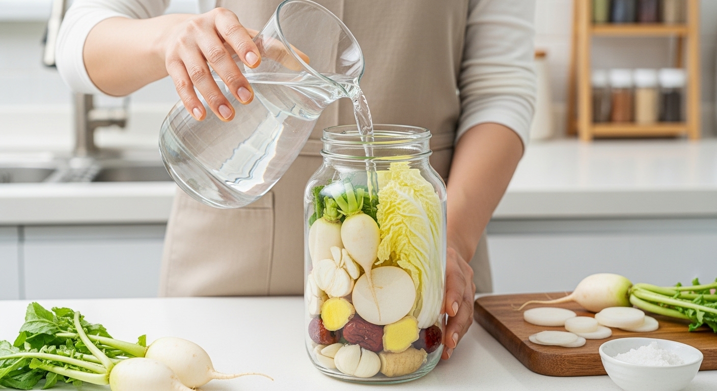 - 실온 숙성 : 담근 직후 하루 정도(약 24시간) 실온(20~25°C)에 둡니다. 이는 유산균이 활발하게 활동을 시작하도록 돕습니다.