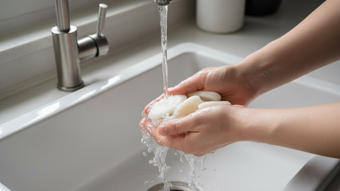 - 찬물에 여러 번 헹궈 표면 전분 제거