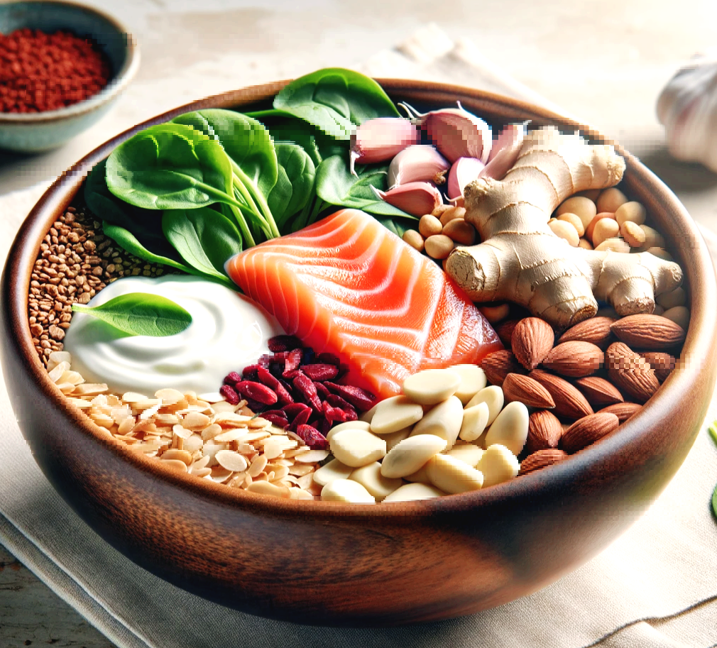 연어에는 오메가-3 지방산이 풍부합니다. 면역 기능을 강화하고 염증을 줄이는 데 도움이 됩니다. 또한 비타민 D가 들어있어 면역 세포를 활성화하는 데 좋습니다.