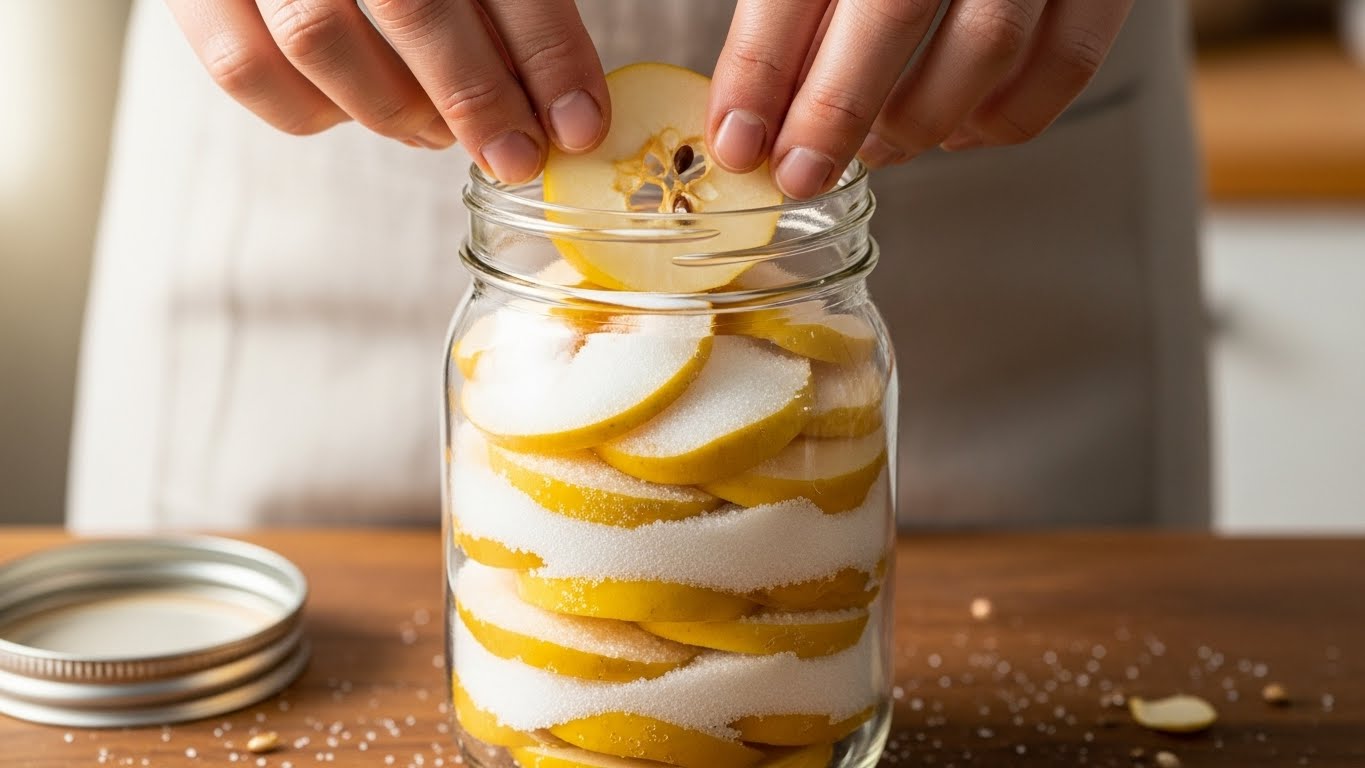 - 모과와 설탕을 켜켜이 넣을 때 윗부분까지 꽉 채우되 공기층을 최소화해야 발효가 안정적입니다.
