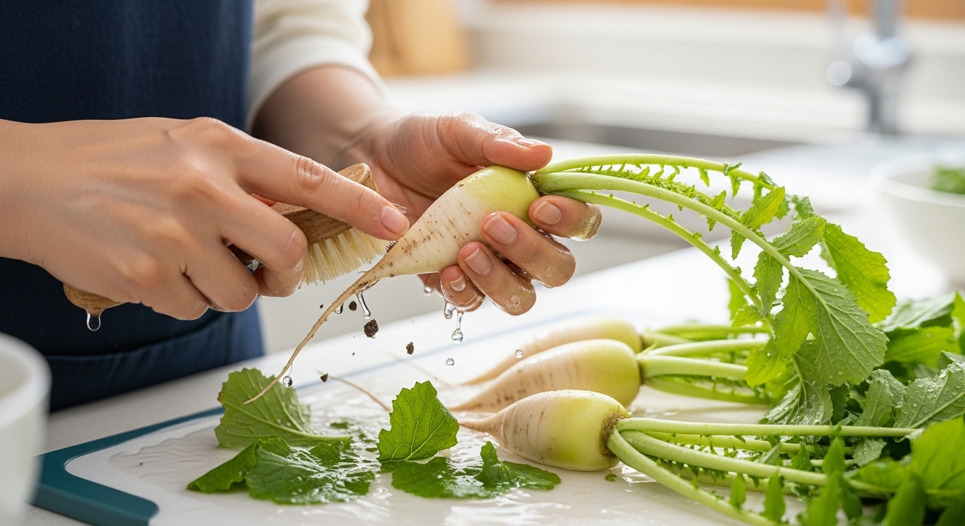 굵은 솔로 총각무 표면을 문질러 미세한 흙까지 완전히 제거해야 텁텁한 맛이 남지 않습니다. - 절임 준비