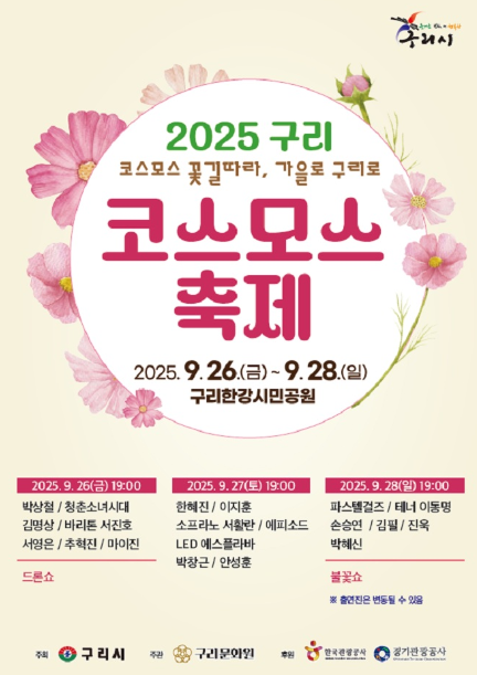 가을이 되면 수도권을 대표하는 아름다운 꽃 축제 바로 구리 코스모스 축제가 열립니다. 드넓은 한강변을 수놓은 아름다운 코스모스와 함께 다채로운 볼거리와 즐길 거리 그리고 풍성한 먹거리가 가득합니다. 2025 구리 코스모스 축제 가수, 일정 및 기본정보를 통해 축제를 완벽하게 즐길 수 있는 모든 팁을 알려드리겠습니다.
