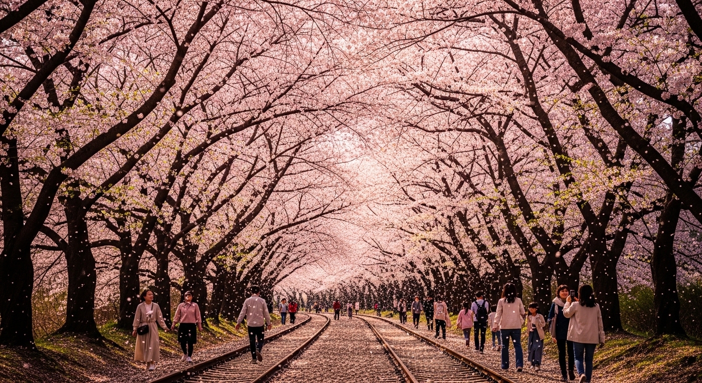 - 진해 군항제 - 3월 말~4월 초, 벚꽃 터널과 철길 풍경